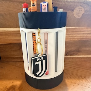 If you, like my son, are a huge collector of Legami pens, then this revolving pen holder is for you! This is the modified model with a personalized name. If you're not interested in personalization, see my other listing. You can choose whether you prefer the keychain or the initial by letting me know in the order notes. I can make it for you in different colors; I've included a few options, but if you'd like a different color, contact me and I'll send you a preview. Obviously, the pens are not included; they're just for demonstration purposes. Thanks to BamBam Design for the project, for which I've purchased a commercial license.